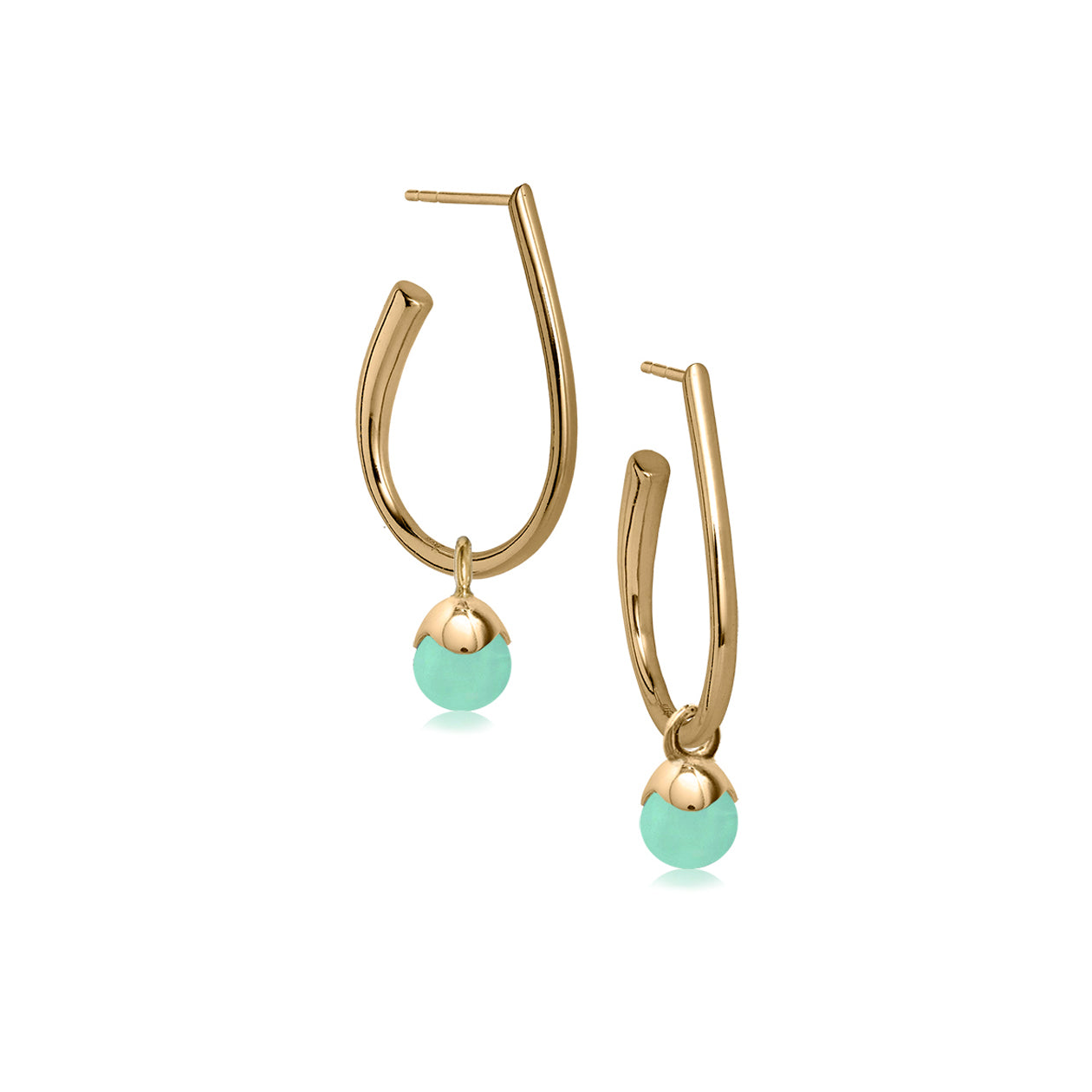 Glory øreringe i 18 karat forgyldt 925 sterlingsølv med aqua kalcedon. De elegante øreringe findes i to størrelser og har et klassisk og lækkert udtryk. Vi har lavet dem som en ørestik, så de er utrolig behagelig at have på. Alle ædelstenene er naturskabte, og smykket er håndlavet af vores dygtige guldsmede.
