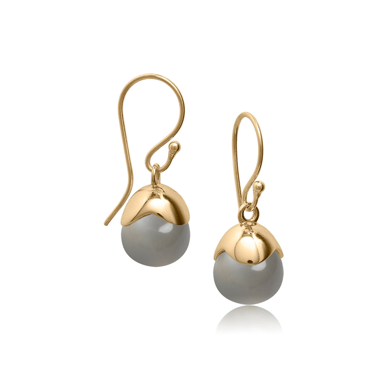 Glory øreringe i 18 karat forgyldt 925 sterlingsølv. Den grå månesten måler 10 mm i dia og har en fantastisk smuk farve. Vi har nøje udvalgt vores naturskabte ædelstene, og smykket er lavet af vores dygtige guldsmede.